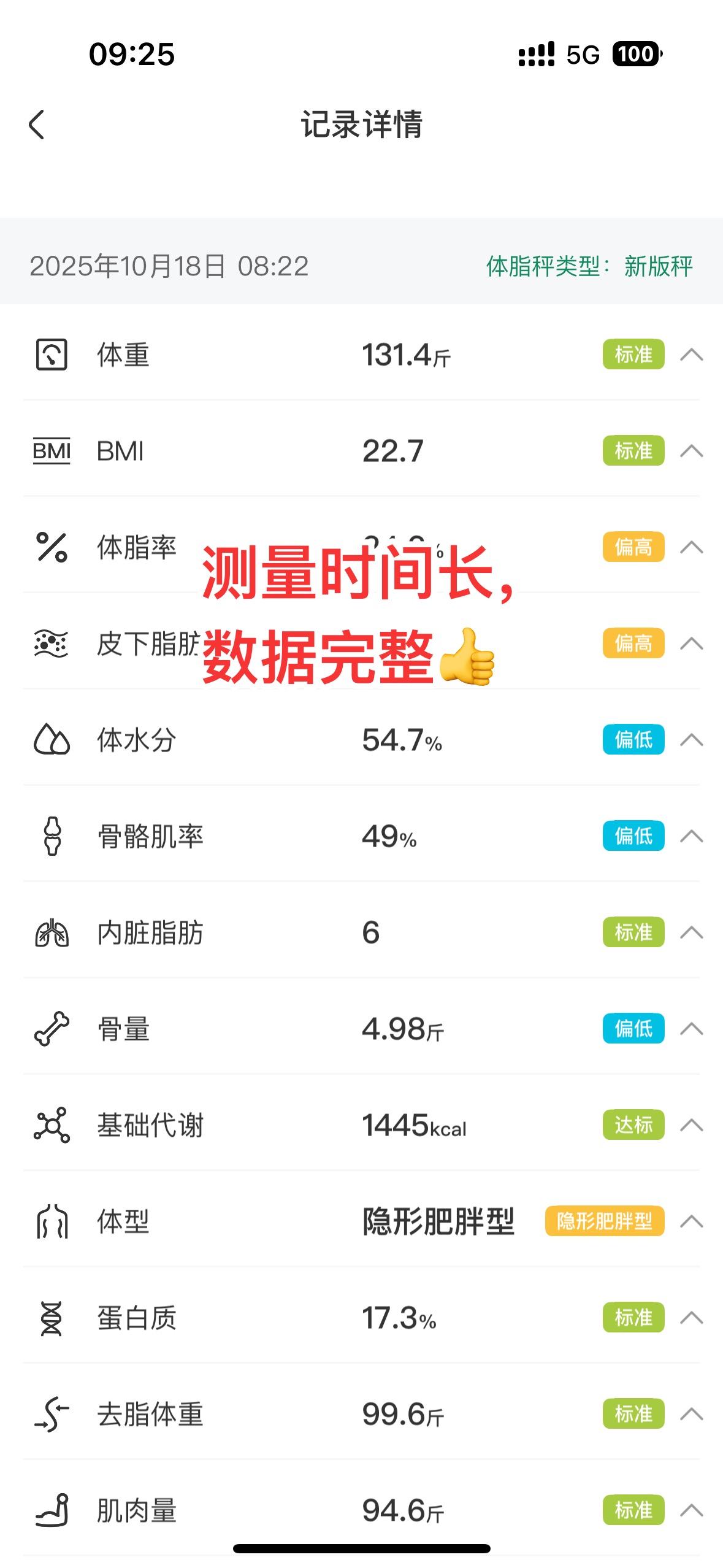 建议:用户在体脂秤上站20-30秒左右,听到“测量完毕”再下秤。 完整的体脂数据(见图2)