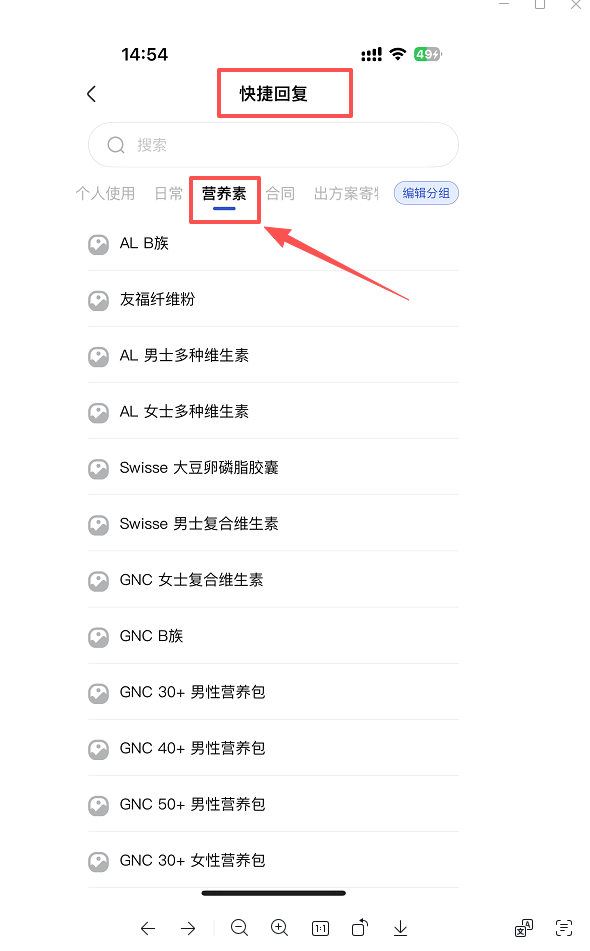 友福商务端—进入用户群—底部胶囊“快捷回复”—找到“营养素”—搜索或选择需要产品名称—点击:转发图片—返回当前用户群查看