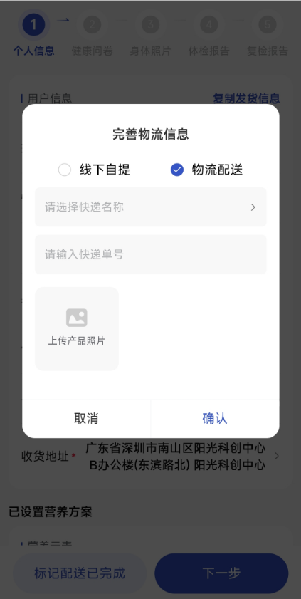 收到健康管理师设置完方案信息后,4 小时内根据方案内容进行配货,核对货物数量、种类与方案一致后,登录【商务端APP】,找到对应群聊,在【用户信息】中选择健康档案,点击【标记配送已完成】,若为配送订单,录入快递单号(物流公司需选择合作物流)和产品照片;若为自提订单,上传产品照片。