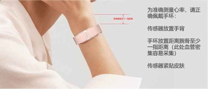 - 佩戴方式 请将手环佩戴在手腕上方,传感器放置手背一面紧贴皮肤,松紧调整至舒适状态,logo和表带置手外侧。正确佩戴有助于实时采集符合人体健康指标更准确的数据,请规范佩戴。